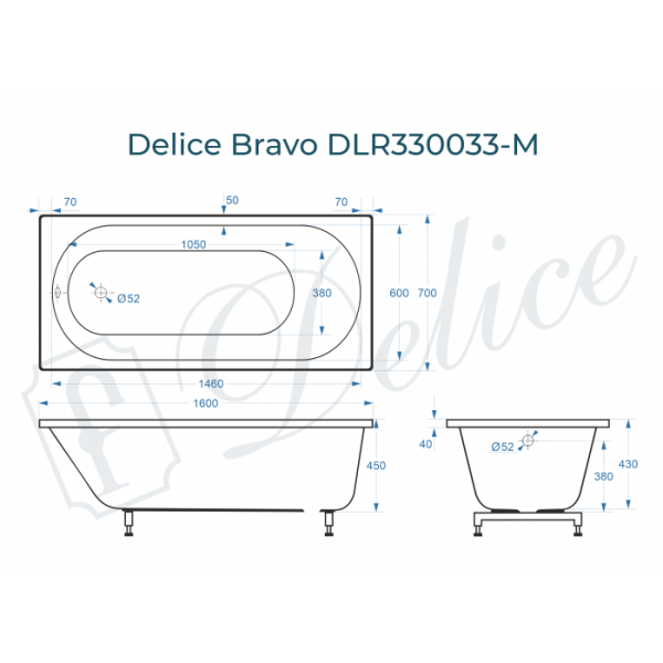 Delice Bravo 160х70 - классическая модель ванны из литьевого мрамора с матовым финишным покрытием. Ванна производится из высокопрочного современного материала. Модель Bravo создана для современных ванных комнат и обладает универсальным дизайном, а, благодаря овальной форме дна, которое смягчает прямоугольную форму самой ванны, она прекрасно впишется в интерьер ванной комнаты. Мягкие линии добавляют ощущение уюта и расслабленности, Delice Bravo создана для отдыха и релаксации. Компактные габариты 160х70 см позволяют установить ванну даже в небольшом помещении.