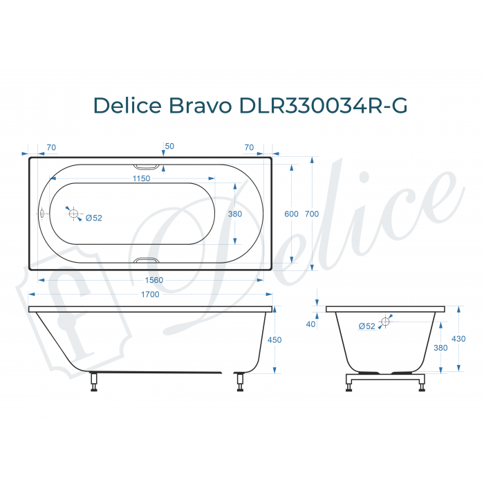 Ванна из литьевого мрамора Delice Bravo DLR330034R-G 170x70 глянцевая с ручками хром