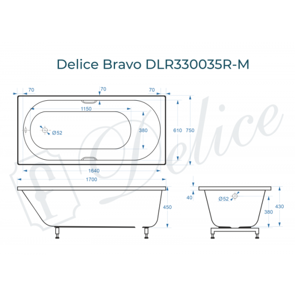 Ванна из литьевого мрамора Delice Bravo DLR330035R-M 170x75 матовая с ручками хром купить