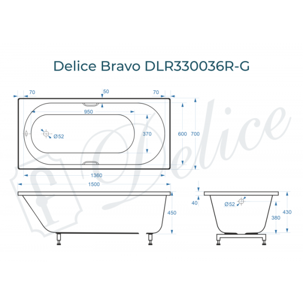 Delice Bravo 150х70 с ручками - классическая модель ванны из литьевого мрамора с глянцевым финишным покрытием. Ванна производится из высокопрочного современного материала. Модель Bravo создана для современных ванных комнат и обладает универсальным дизайном, а, благодаря овальной форме дна, которое смягчает прямоугольную форму самой ванны, она прекрасно впишется в интерьер ванной комнаты. Мягкие линии добавляют ощущение уюта и расслабленности, Delice Bravo создана для отдыха и релаксации. Компактные габариты 150х70 см позволяют установить ванну даже в небольшом помещении.