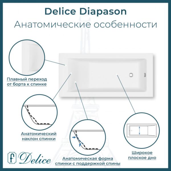 Для установки используются фирменные ножки Delice, которые имеют надежное и прочное крепление, обеспечивают высокую устойчивость ванны и регулируются по высоте. Высота на ножках варьируется от 59.5 до 63 см. С помощью регулировки можно нивелировать геометрические отклонения пола, стен и углов в ванной комнате. За счет высокой плотности материала, при установке не требуется шумоизоляция, а также заземление, так как литьевой мрамор не проводит электрический ток. При необходимости изменения габаритов под ванную комнату, борты ванны можно уменьшить механической обработкой.