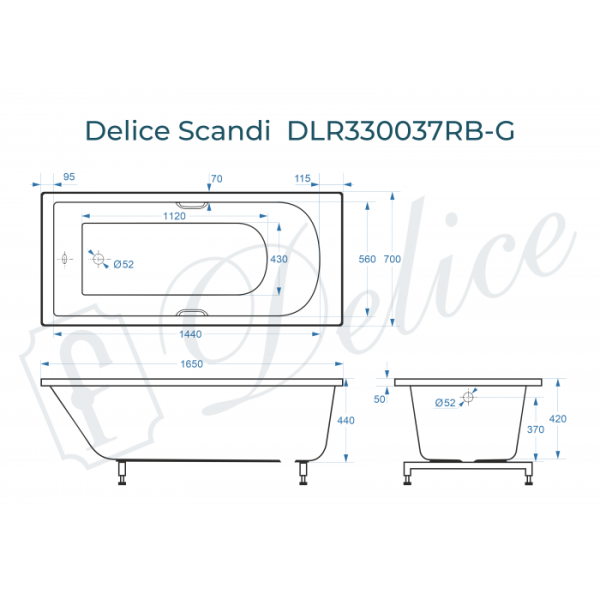 Ванна из литьевого мрамора Delice Scandi DLR330037RB-G 165x70 глянцевая с чёрными ручками