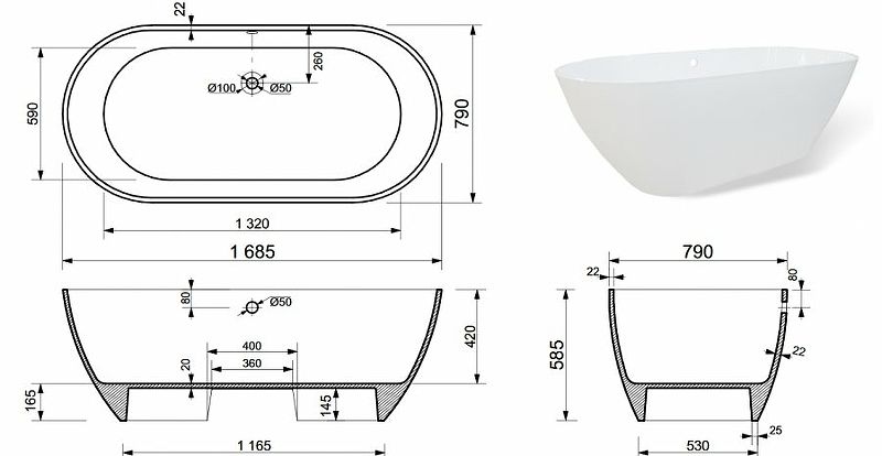 Ванна из литьевого мрамора Эстет Майами ФР-00003615 168x79см белый
