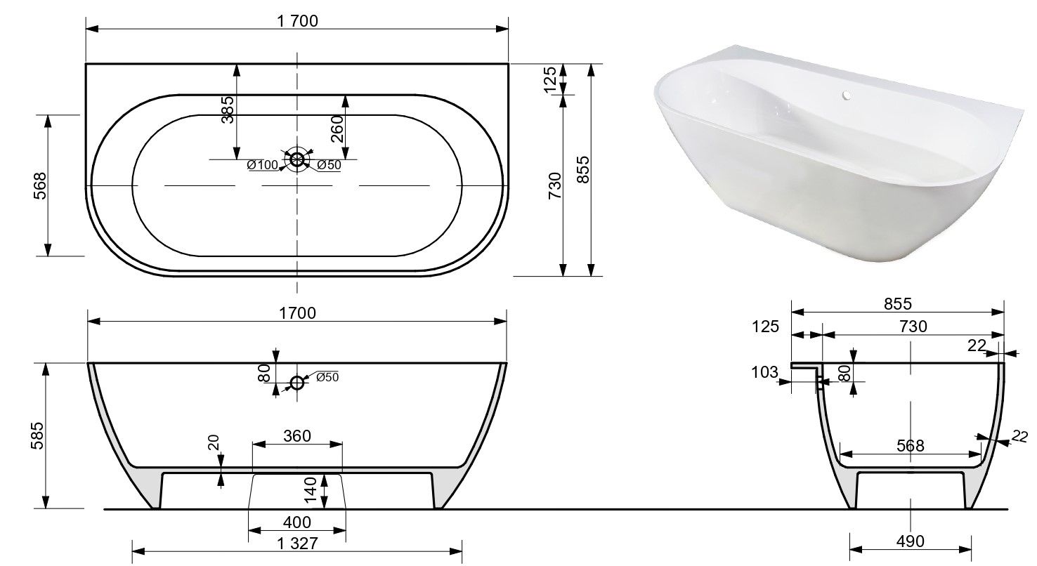Ванна из литьевого мрамора Эстет Майами ФР-00010630 170x85см белый