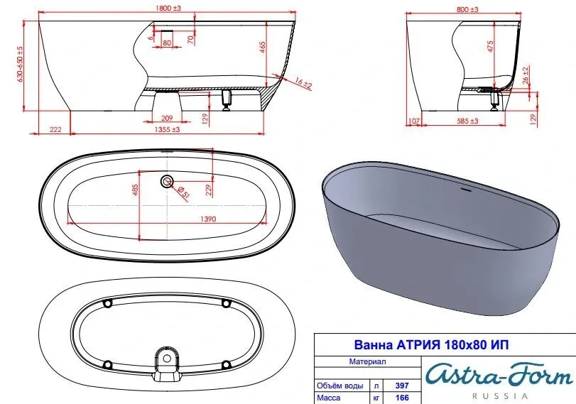 Ванна из литого мрамора Astra-Form Атрия 180x80 с интергрированным переливом