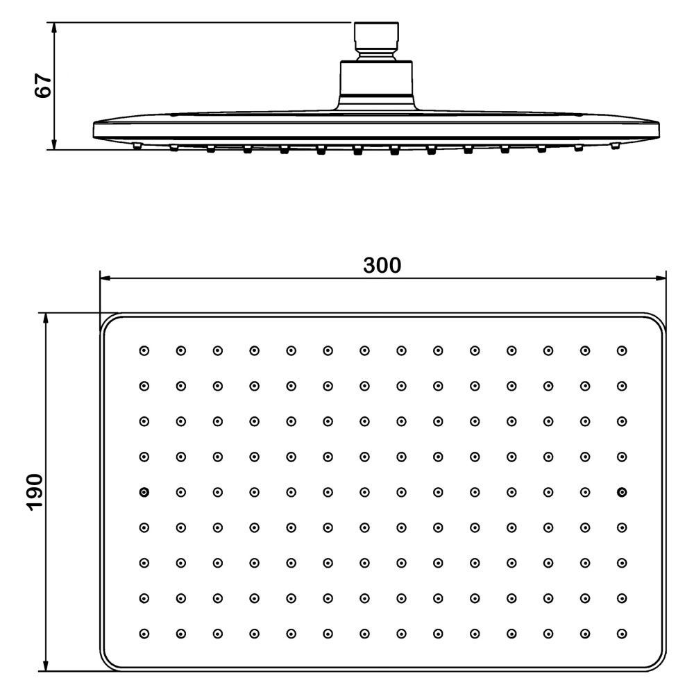 Верхняя душевая насадка Хромированная лицевая поверхность.Система Air-In. Латунный шарнирный крепежРазмер - 300х190 мм.