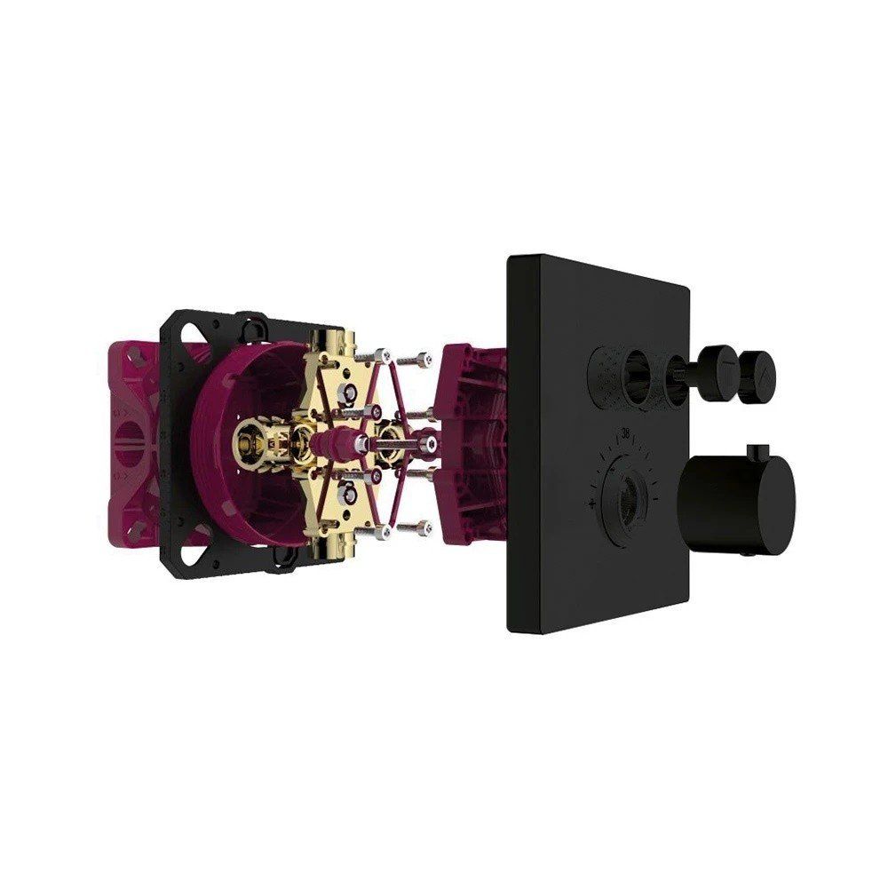 Термостатический смеситель для ванны на 2 потребителя (чёрный матовый). Комплект поставки: рукоятка, гильза, розетка, функциональный блок, кнопки; 2 потребителя; возможно одновременное включение нескольких потребителей (душей); картридж термостата, вентиль Вкл./Выкл.; предохранительный ограничитель при 38° C; регулируемое ограничение температуры; в состав поставки уже входит скрытая часть AQM8800.