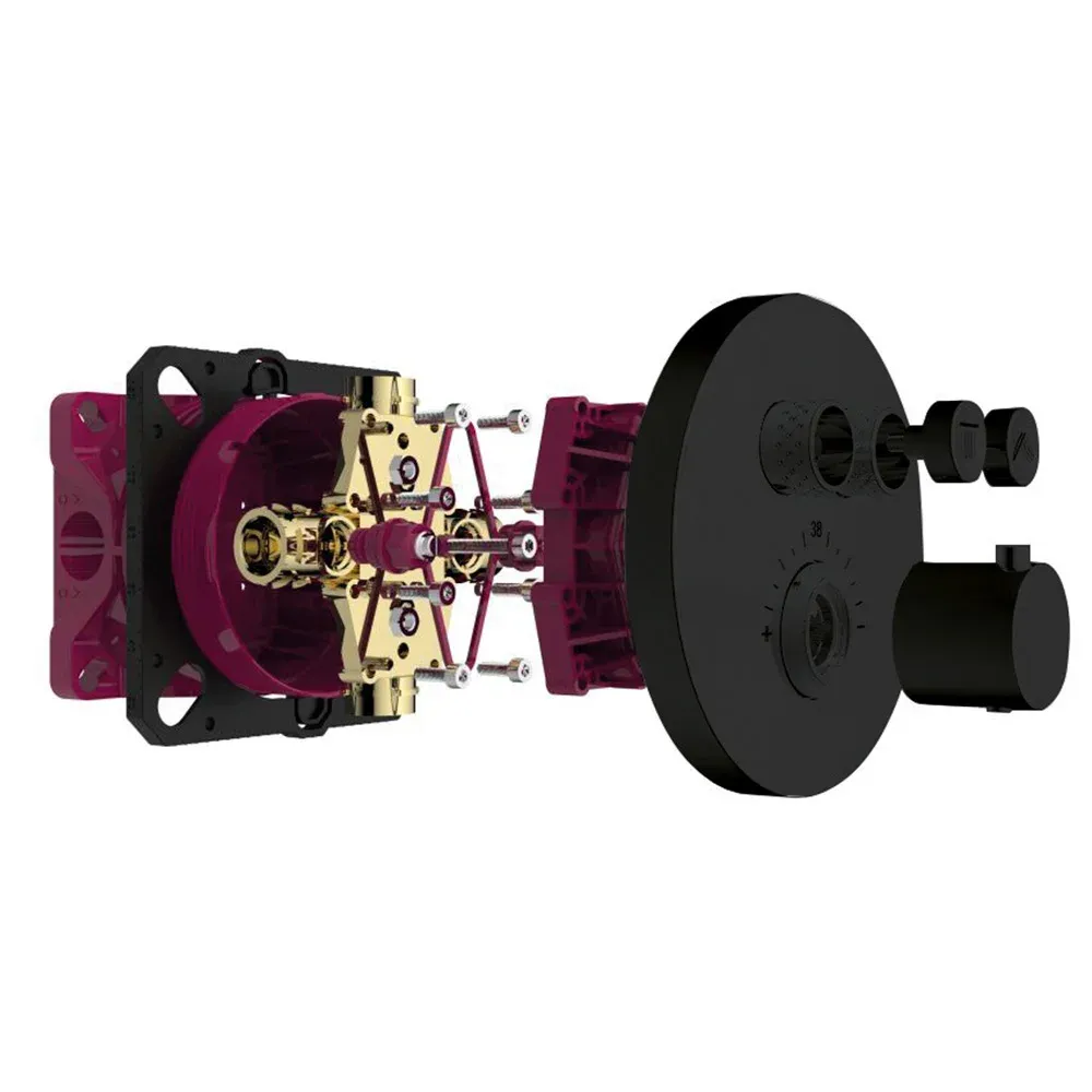 Термостатический смеситель для ванны на 2 потребителя (чёрный матовый). Комплект поставки: рукоятка, гильза, розетка, функциональный блок, кнопки; 2 потребителя; возможно одновременное включение нескольких потребителей (душей); картридж термостата, вентиль Вкл./Выкл.; предохранительный ограничитель при 38° C; регулируемое ограничение температуры; в состав поставки уже входит скрытая часть AQM8800.