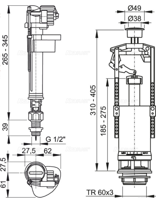 - Конструкция позволяет регулировать высоту механизма в зависимости от высоты бачка