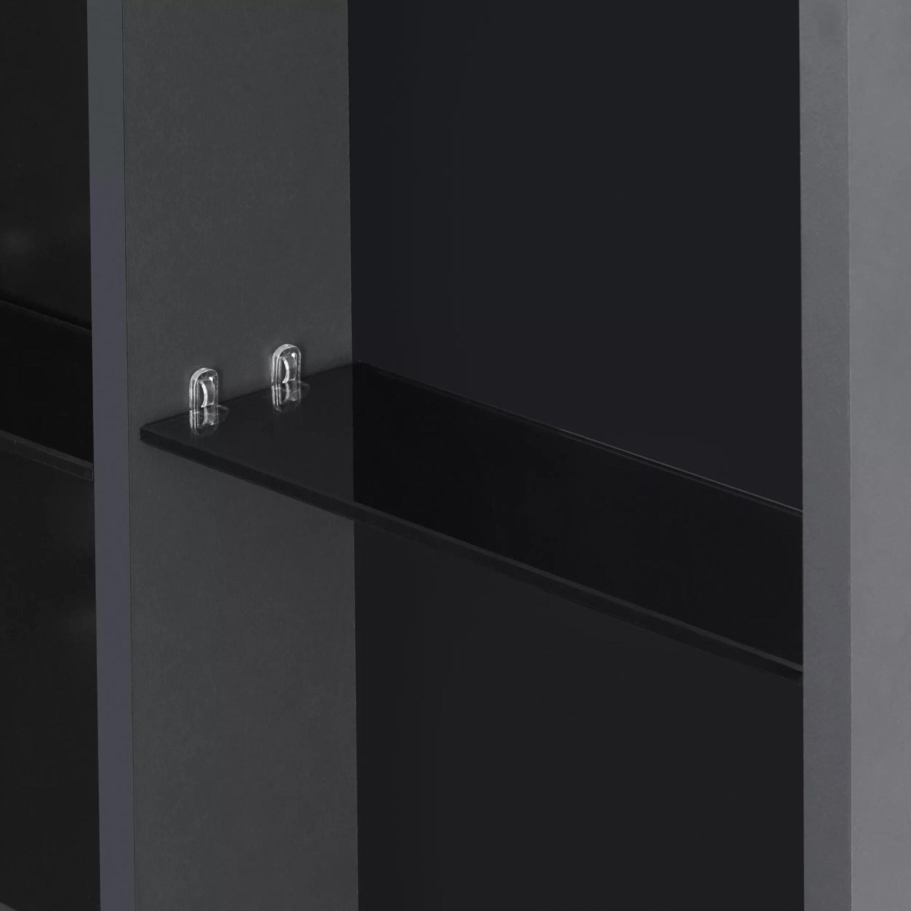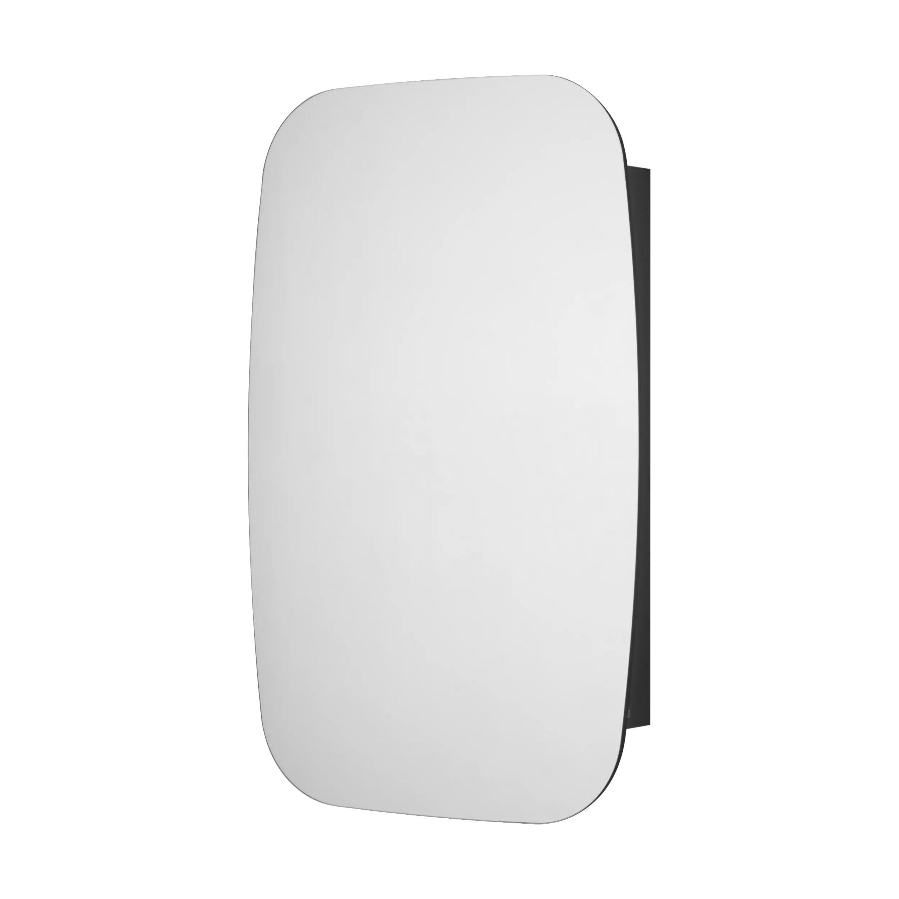 Сохо зеркало необычной овальной формы, скругленные углы добавляют индивидуальности изделию и безопасны в эксплуатации. Корпус и фасад выполнены также в цветовой гамме антрацит. Фасад оснащен петлями с доводчиком. За фасадом с зеркальным полотном расположена ассиметричная конструкция полочек, позволяющая хранить косметические средства различной высоты и объема. Перегородки из ЛВДСП антрацит сочетаются со стеклянными полочками цвета графит.