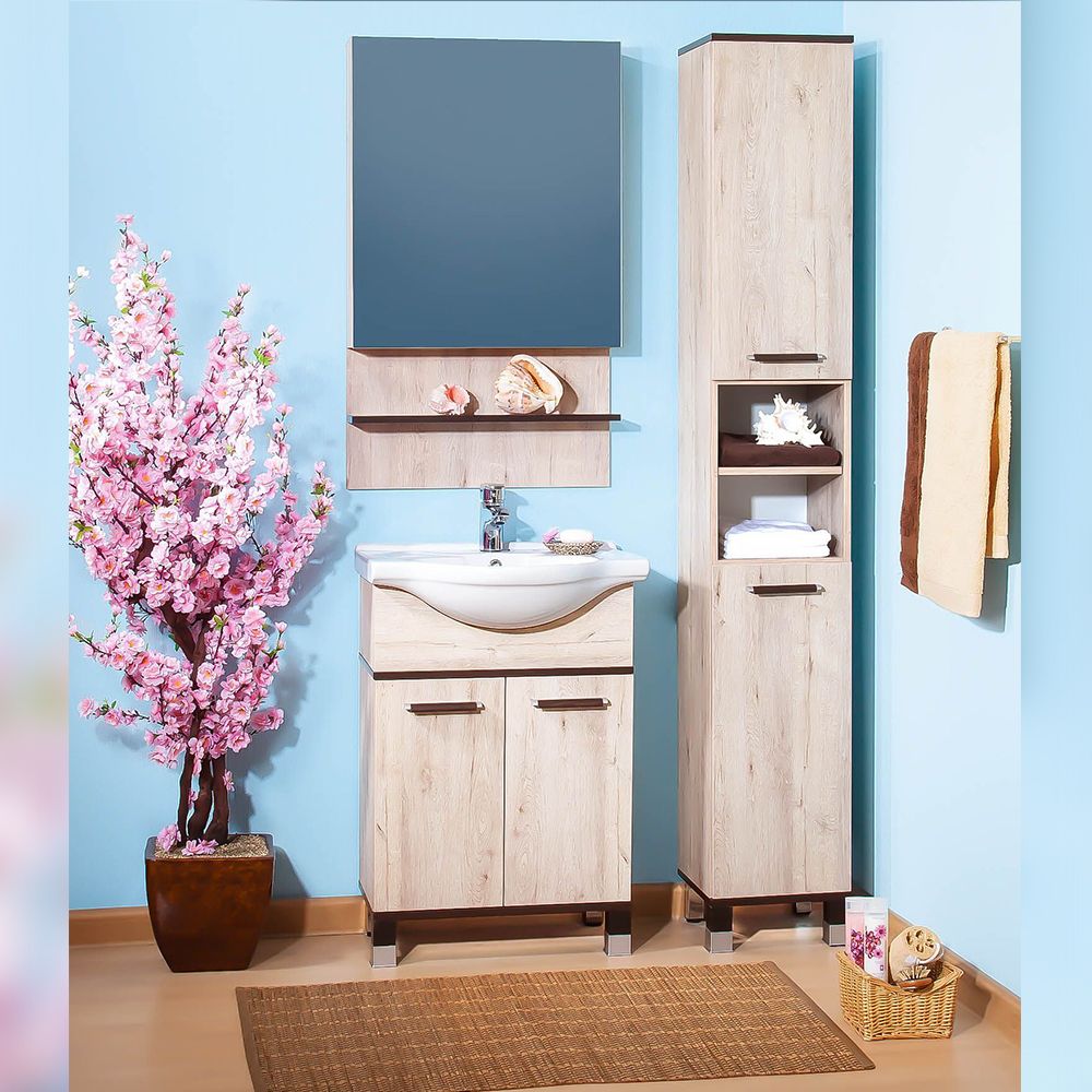 Внутреннее содержание шкафа умело организовано: разнообразные полки и отсеки позволяют удобно разместить все необходимые аксессуары – от косметики до бытовой химии. Зеркало, интегрированное в фасад, визуально расширяет пространство и облегчает утренние рутинные процедуры.