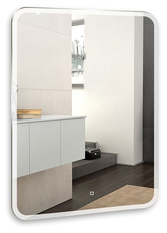 Зеркало оснащено сенсорным выключателем с функцией плавного диммирования с запоминанием последнего значения. Короткое касание светящейся области включает/выключает подсветку, длительное касание меняет яркость свечения.