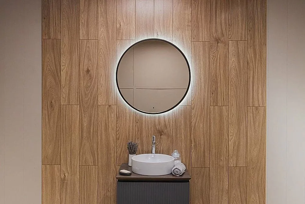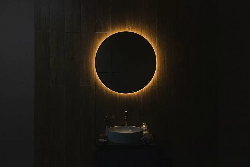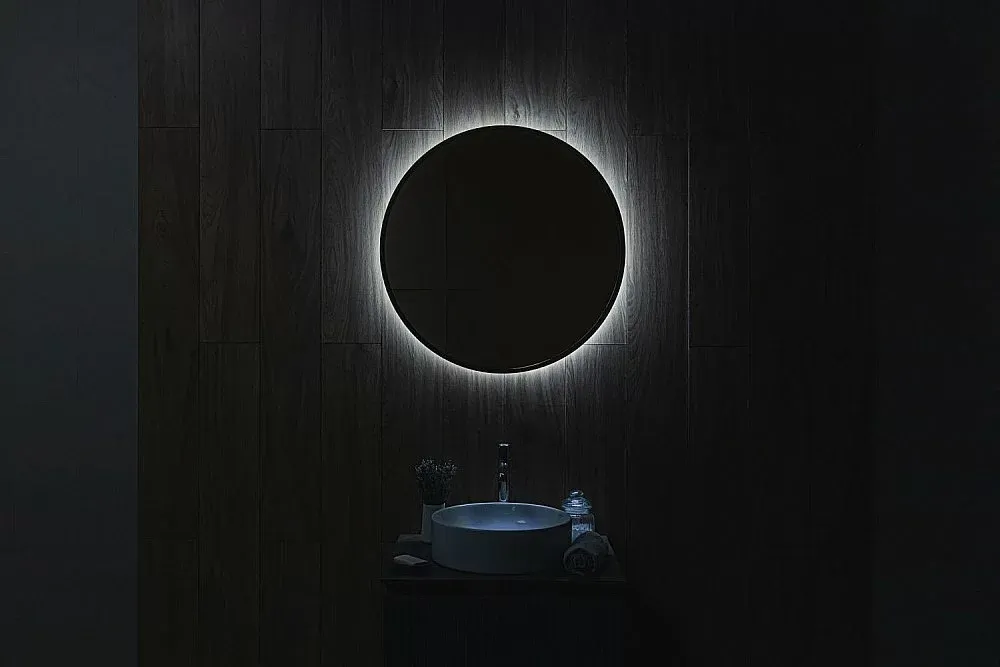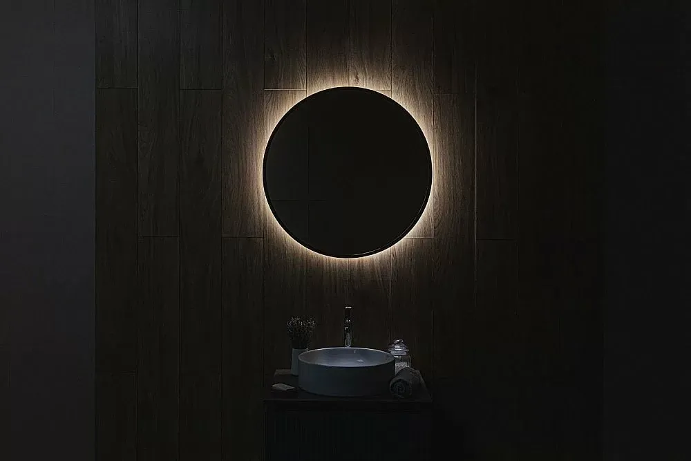 Ореольная подсветка подчеркивает форму зеркала и создает эффект парения.