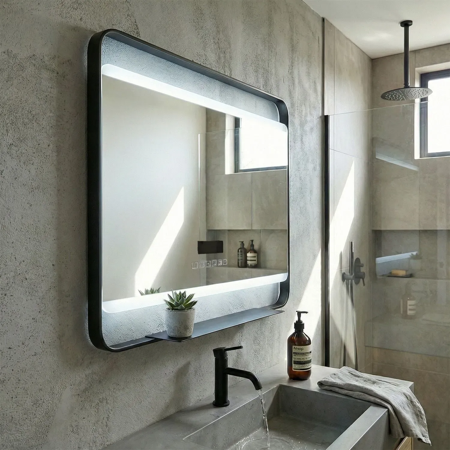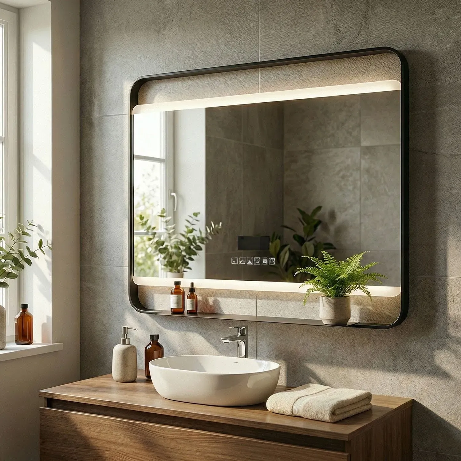 Освещение: По периметру расположена светодиодная подсветка, создающая мягкий, равномерный свет без теней, идеально подходящий для макияжа или бритья.