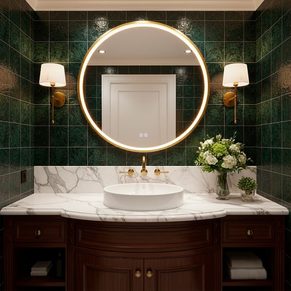 • Алюминиевый корпус золотого матового цвета: Прочный и стильный алюминиевый корпус обеспечивает долговечность и придает зеркалу элегантный, современный вид.