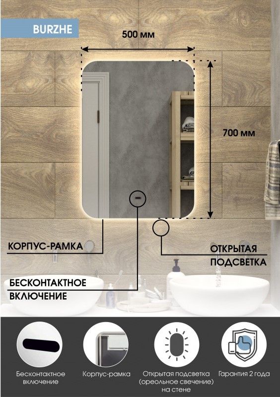 Зеркало "Burzhe Led" 500х700 с бесконтактным сенсором, холодная подсветкаLED подсветка 6000Кбесконтактный сенсор с функцией димированияореольная подсветка