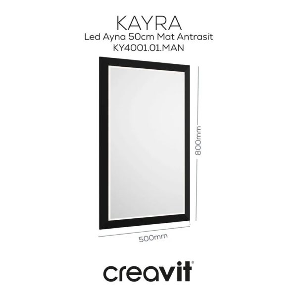 Creavit Kayra KY4001.01.MAN Зеркало с подсветкой 500*800 мм (антрацит матовый). Материал корпуса МДФ, покрытие лаковое, форма прямоугольная, LED-подсветка, свет белый, включается простым касанием руки, монтаж настенный подвесной.