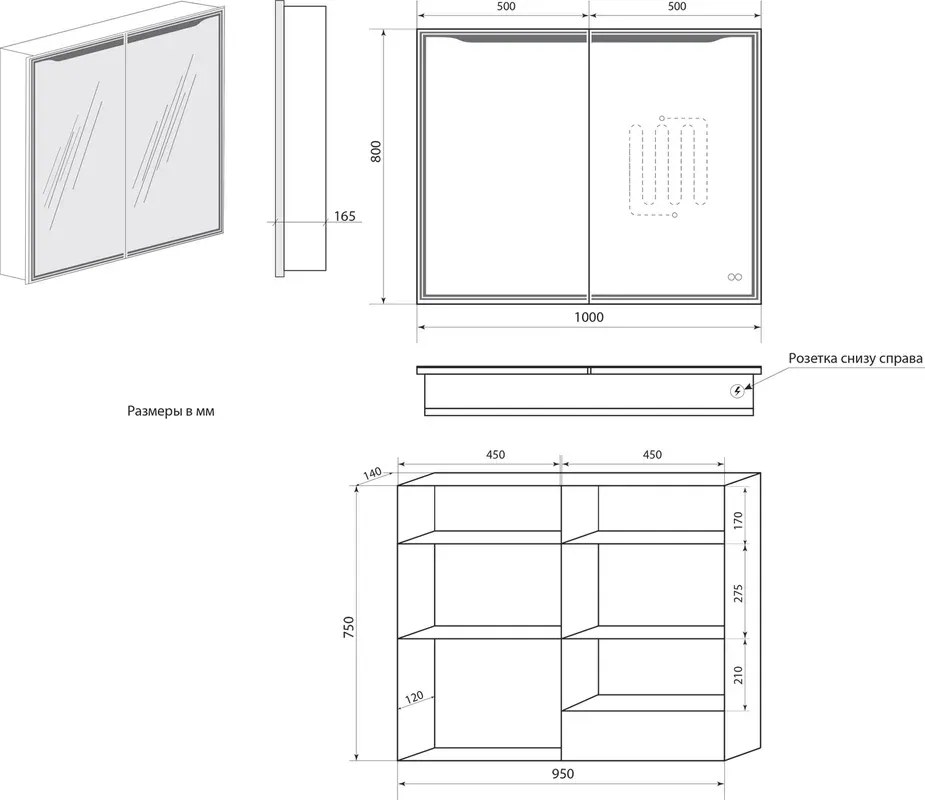 Оснащение: зеркало-шкаф,провод с вилкой 1м,розетка,4 полки, навес, коробка, инструкция