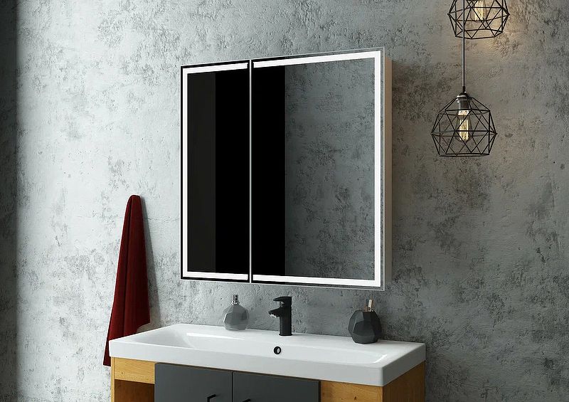 Зеркало-шкаф "Allure Led" 800х800 с датчиком движения, розеткойLED подсветка 6000К; датчик движения, Материал корпуса - влагостойкий ЛДСП + МДФ в пленке ПВХ, розетка, две створки