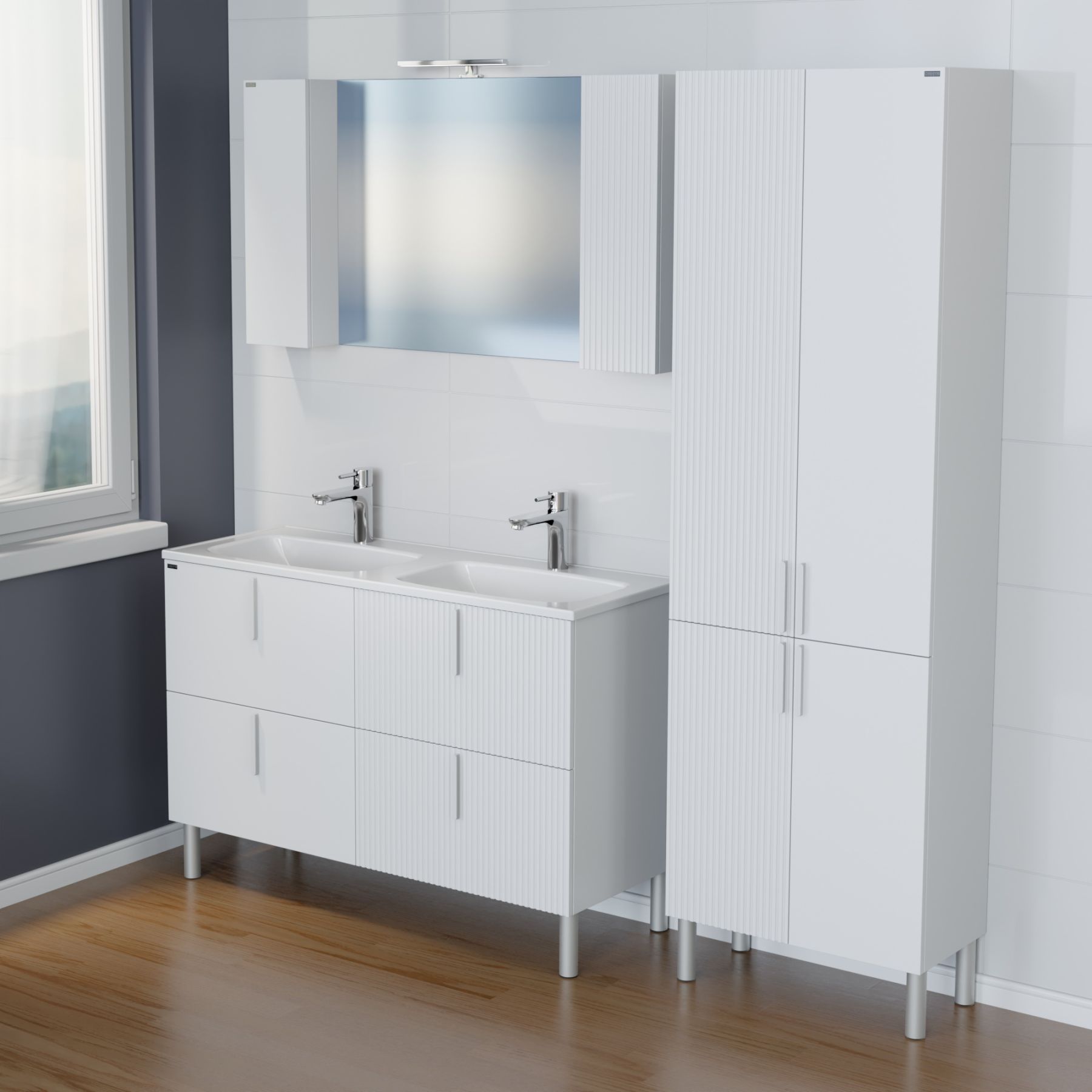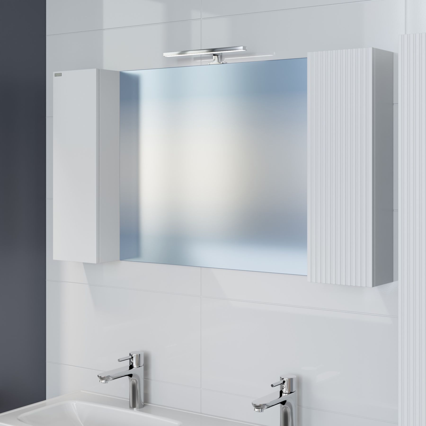 Коллекция мебели для ванной комнаты Санта Вега — это современное решение для вашей ванной комнаты. Фасады и боковины выполнены из МДФ и покрыты глянцевой эмалью. Дверцы оснащены петлями плавного закрывания. Один фасад зеркального шкафа выполнен с вертикальной реечной фрезеровкой, второй покрыт белой глянцевой эмалью. В комплектацию входит светильник, который можно подключить к внешней проводке ванной комнаты, выключатель в комплектацию не входит.